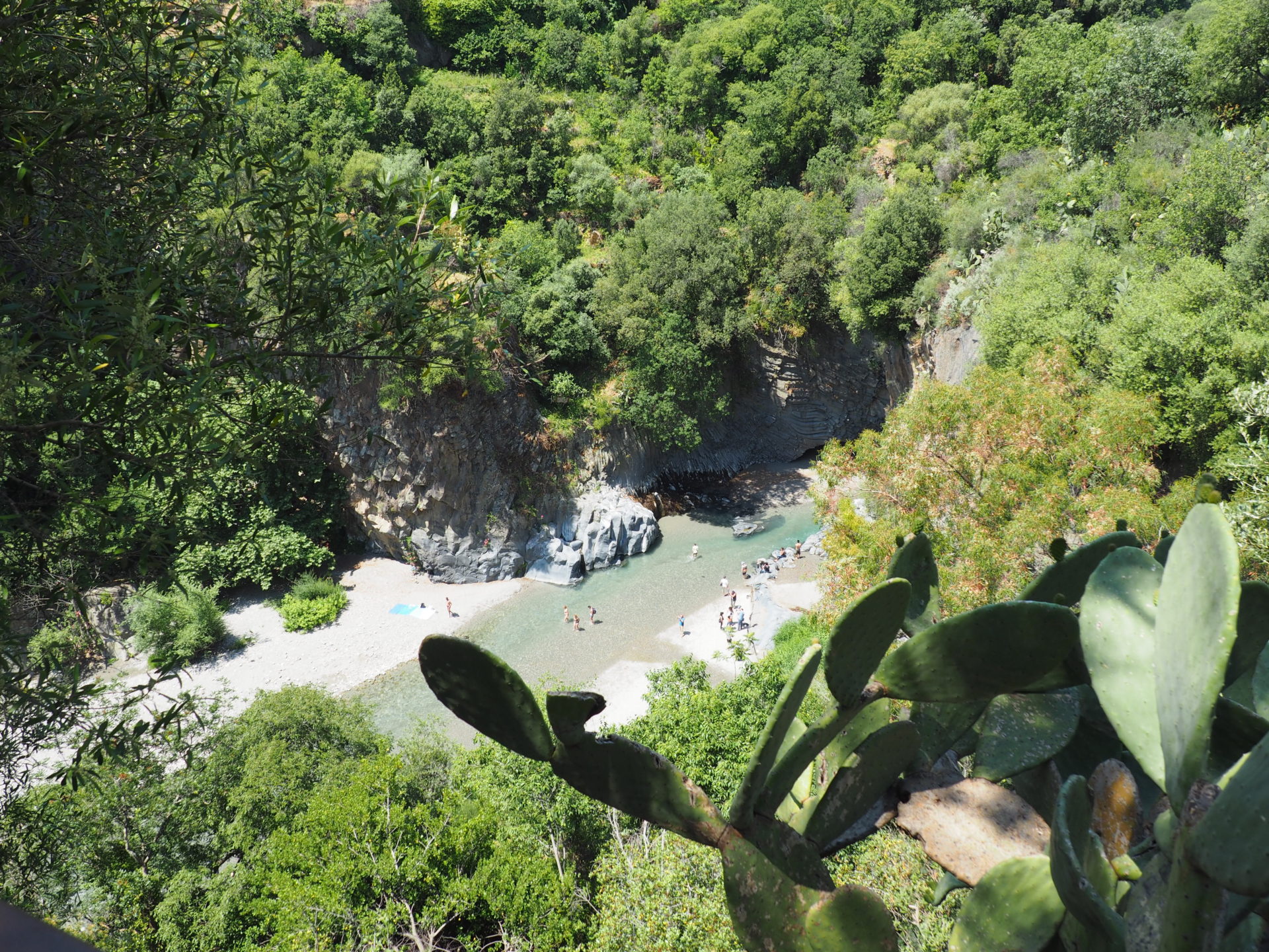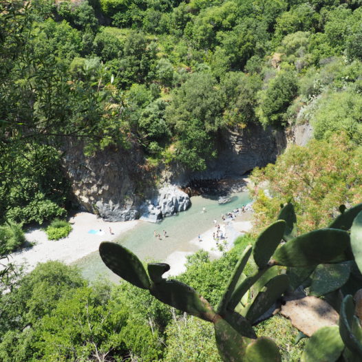 You can park your car nearby the site. While climbing down the stairs you easily enter the Alcantara gorge, were you can have a refreshing bath. The landscape at the bottom is wonderful; you gaze into the deep gorge where fast flowing clear waters rush through the valley and its fascinating geology. All in all a lovely spot to spend a couple of hours.