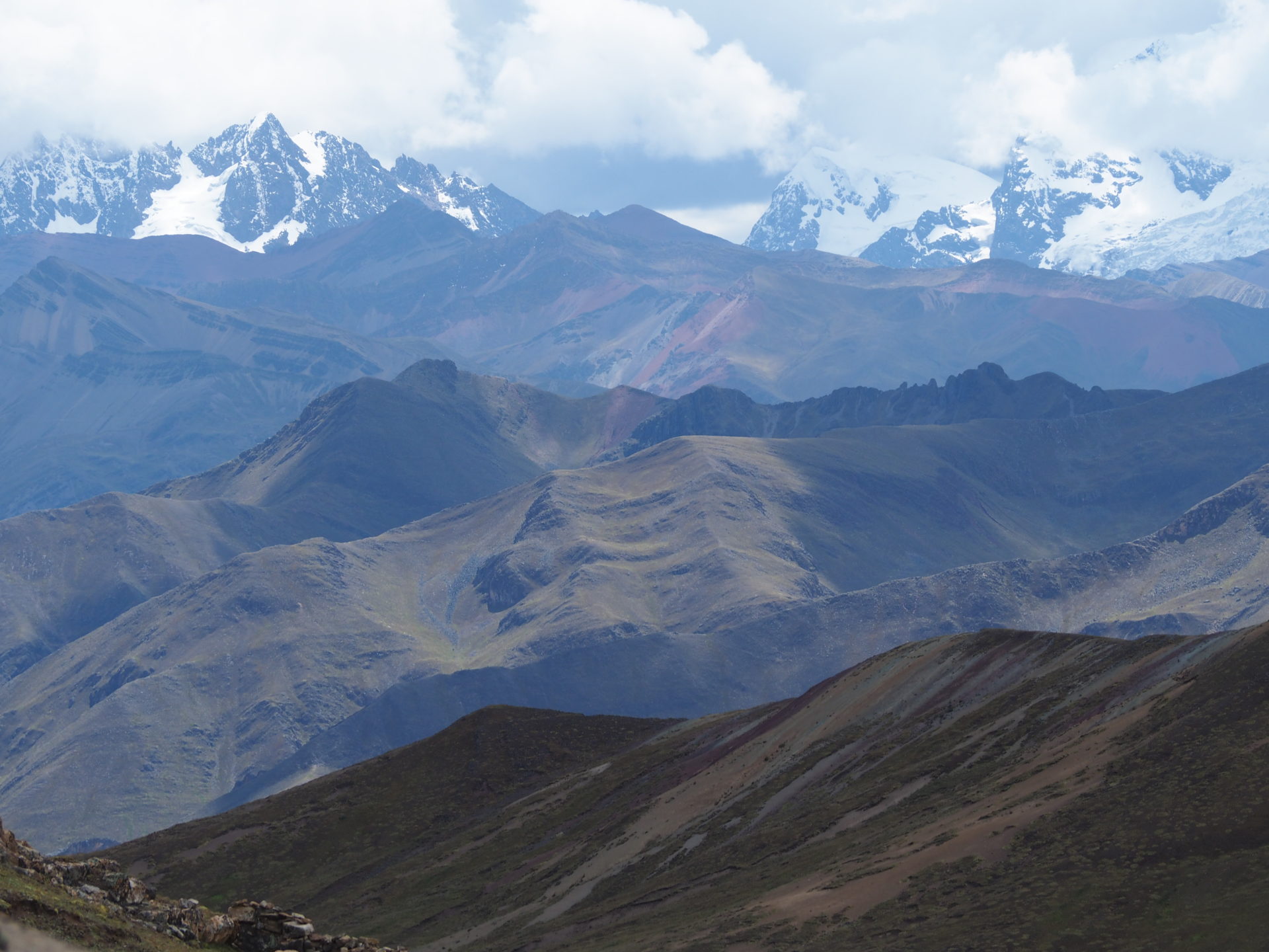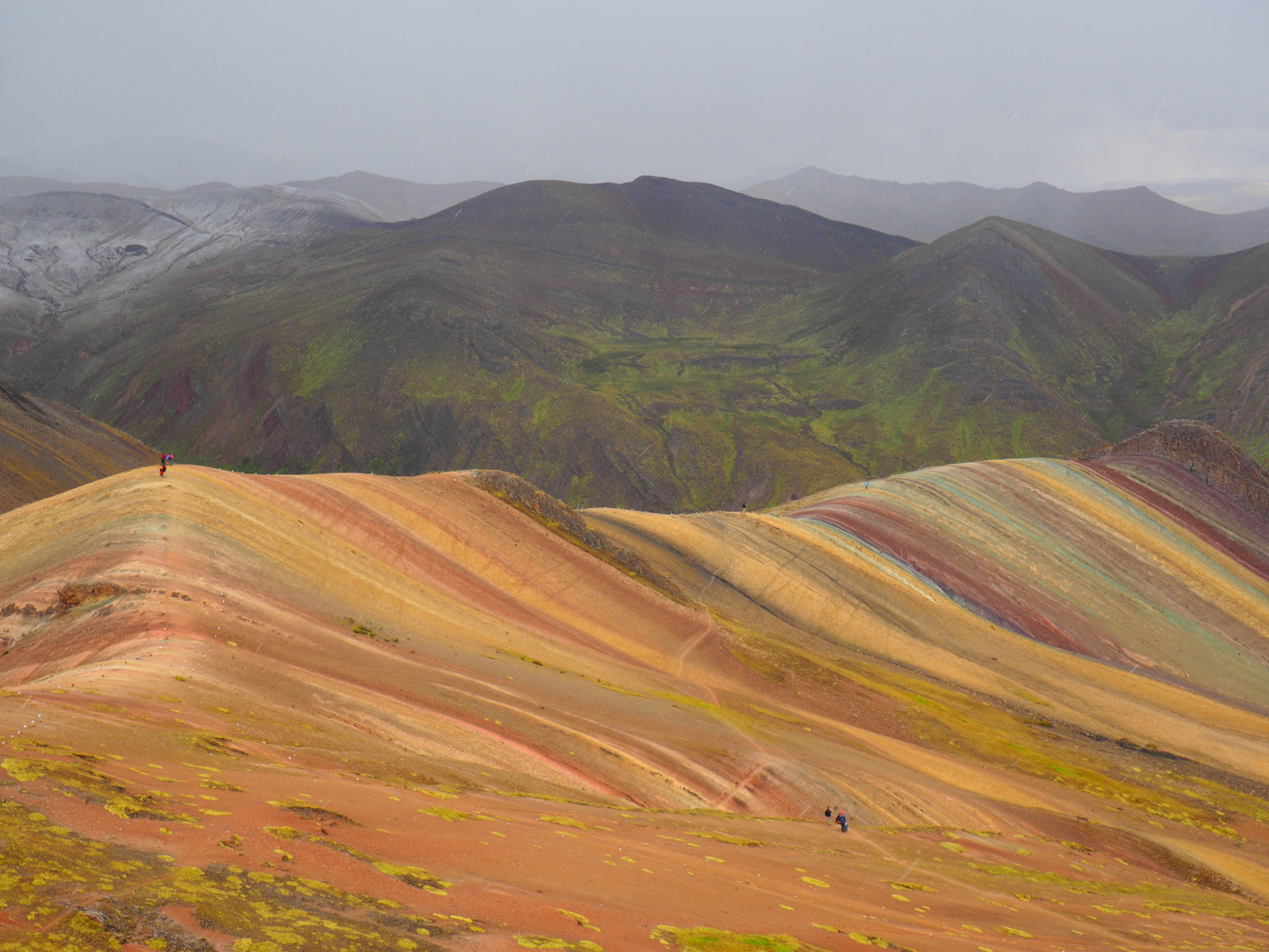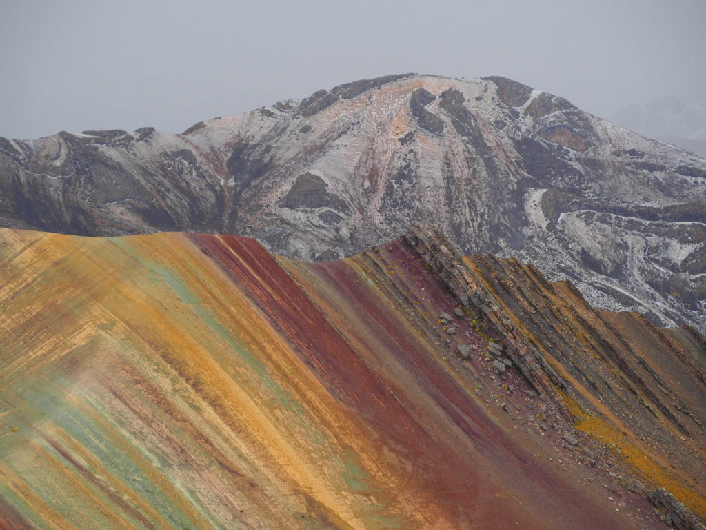 The view at the snow-capped Ausangate mountain on the other side of the area is absolutely amazing as well. And as it started to snow at the end of our visit, we also were better able to see the contrast between the colourful range and the white peaks behind it.
