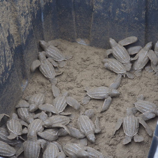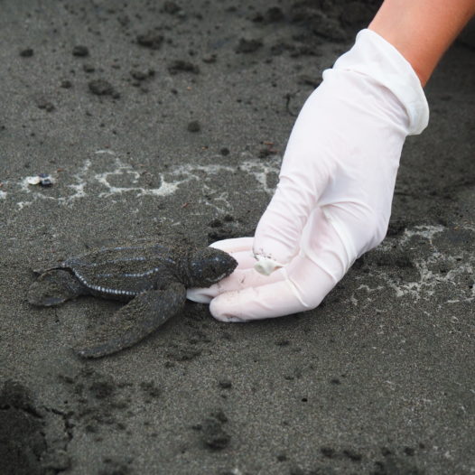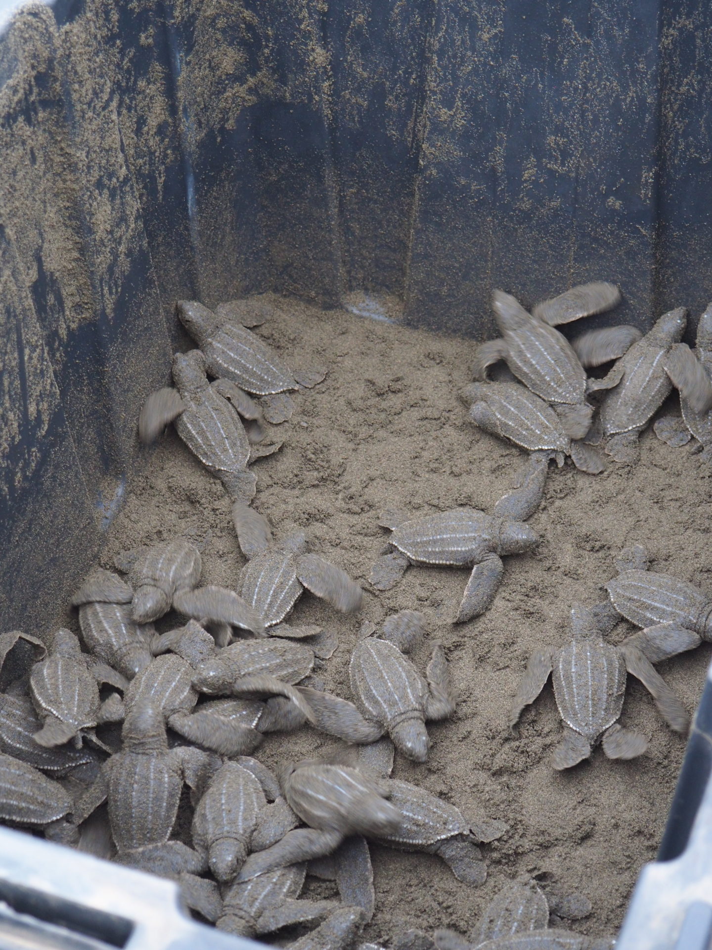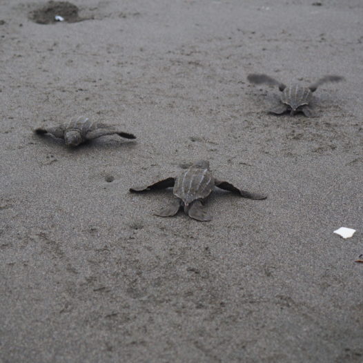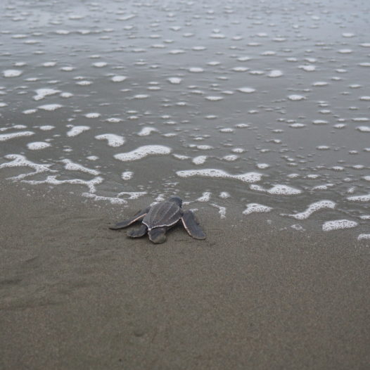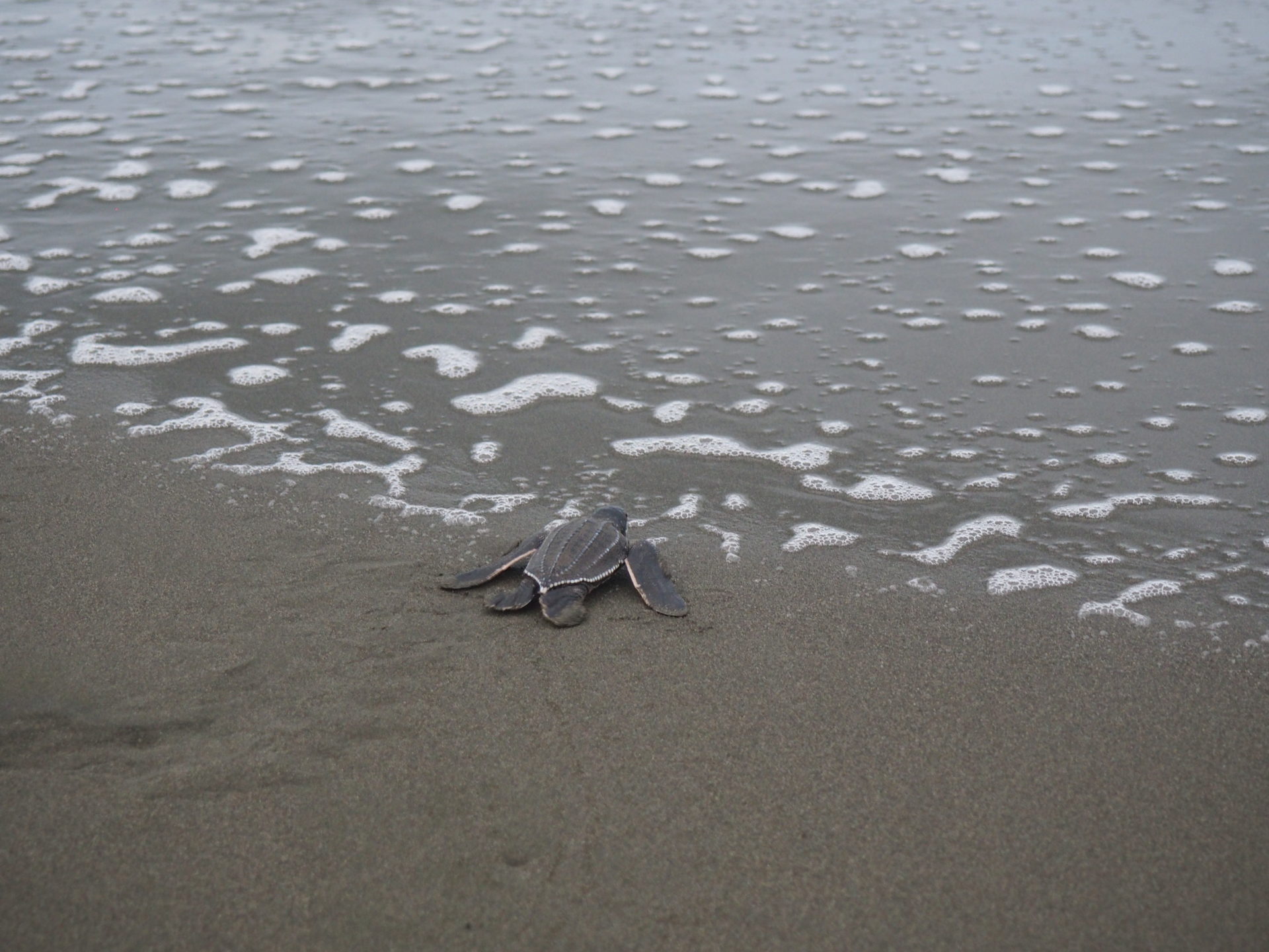 I pick up a tortuguita from the box and hold it for a second. If you’ve ever seen mature leatherback turtles, it is an incredible idea that their babies fit the palm of your hand. How tiny they are compared to their full-size parents; the head of the leatherbacks is even bigger than ours. The same strength however, though in tinier version, is already visible. With all its mighty powers the tortuguita is swimming in the air on my hand in order to reach the ocean as soon as possible. Once at the ground it is pushing away sand as if its life depends on it. And since the turtles are still prey to birds, it kind of does.