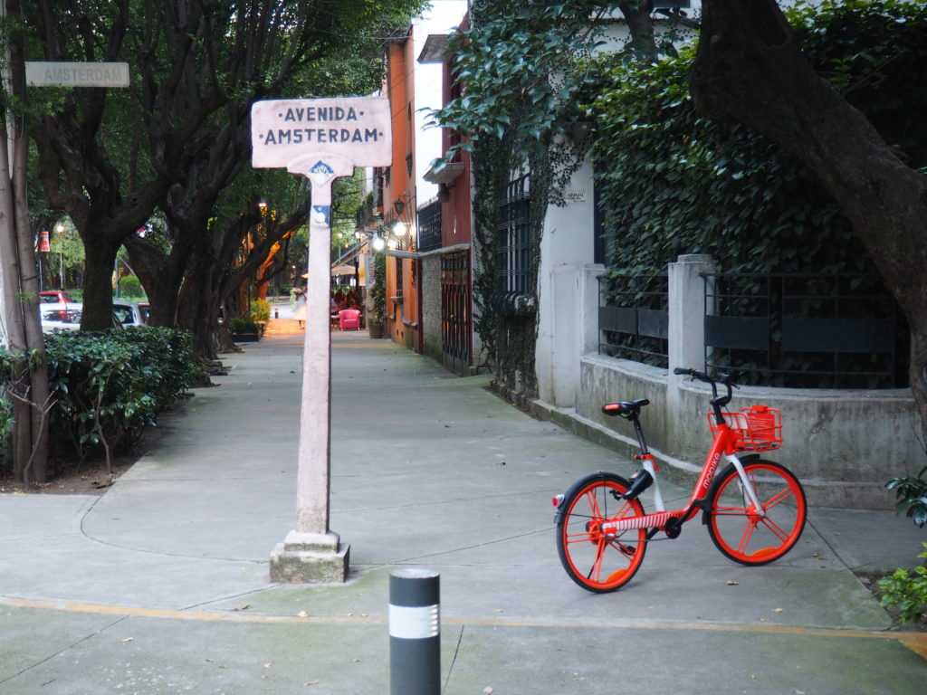 There are several sharing bike platforms in Mexico City, which is absolutely great. Our Airbnb host seemed to be most enthusiastic about Mobike. Perhaps because a lot of the Mobike bikes are around in La Condesa.