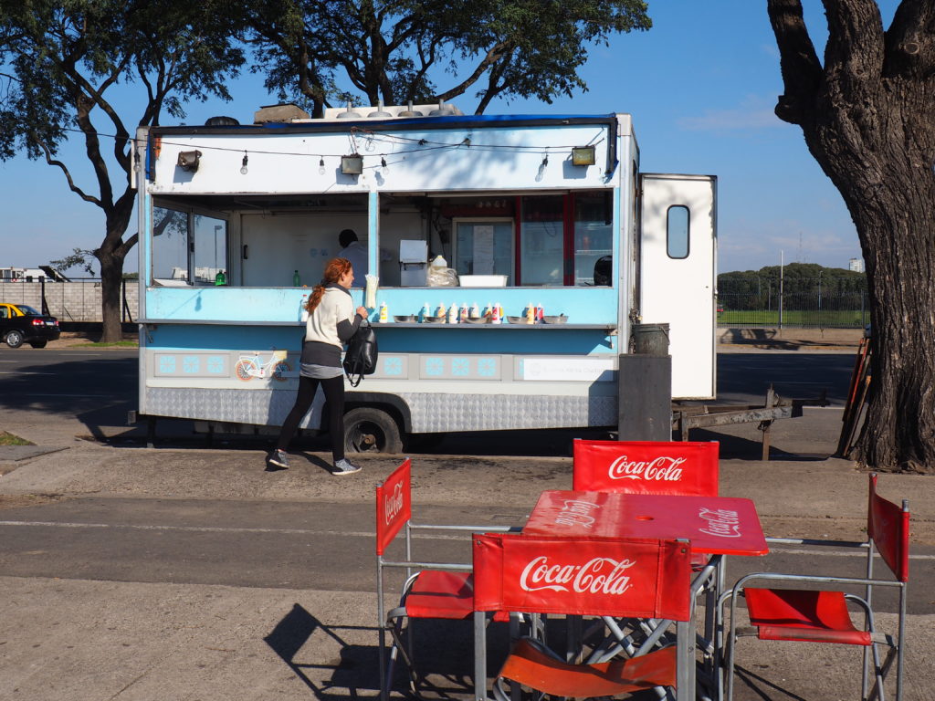 All warmed up, we cycled along the Costanera from the north to the south. Time for lunch, which served the ultimate Argentine street food today: a delicious choripan (a sandwich with chorizo and chimichurri)! Rumour has it that the stands where we were having lunch, located near the Airport Jorge Newbery, are the best ones in town. And I’m very willing to believe it.
