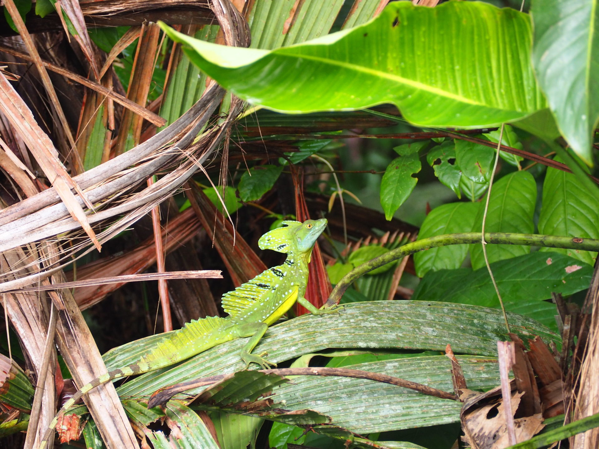 A bit more difficult to spot is the next animal: the green basilisk. This reptile is also called a ‘Jesus walker’ as it is mythically able to walk (or let’s say run) over water whenever in a hurry. Not today. He sits like he’s modeling for Madame Tussauds -“He’s made of plastic. I put him there yesterday for you” jokes Luis – as his image absolutely disappears in the green background of the jungle.