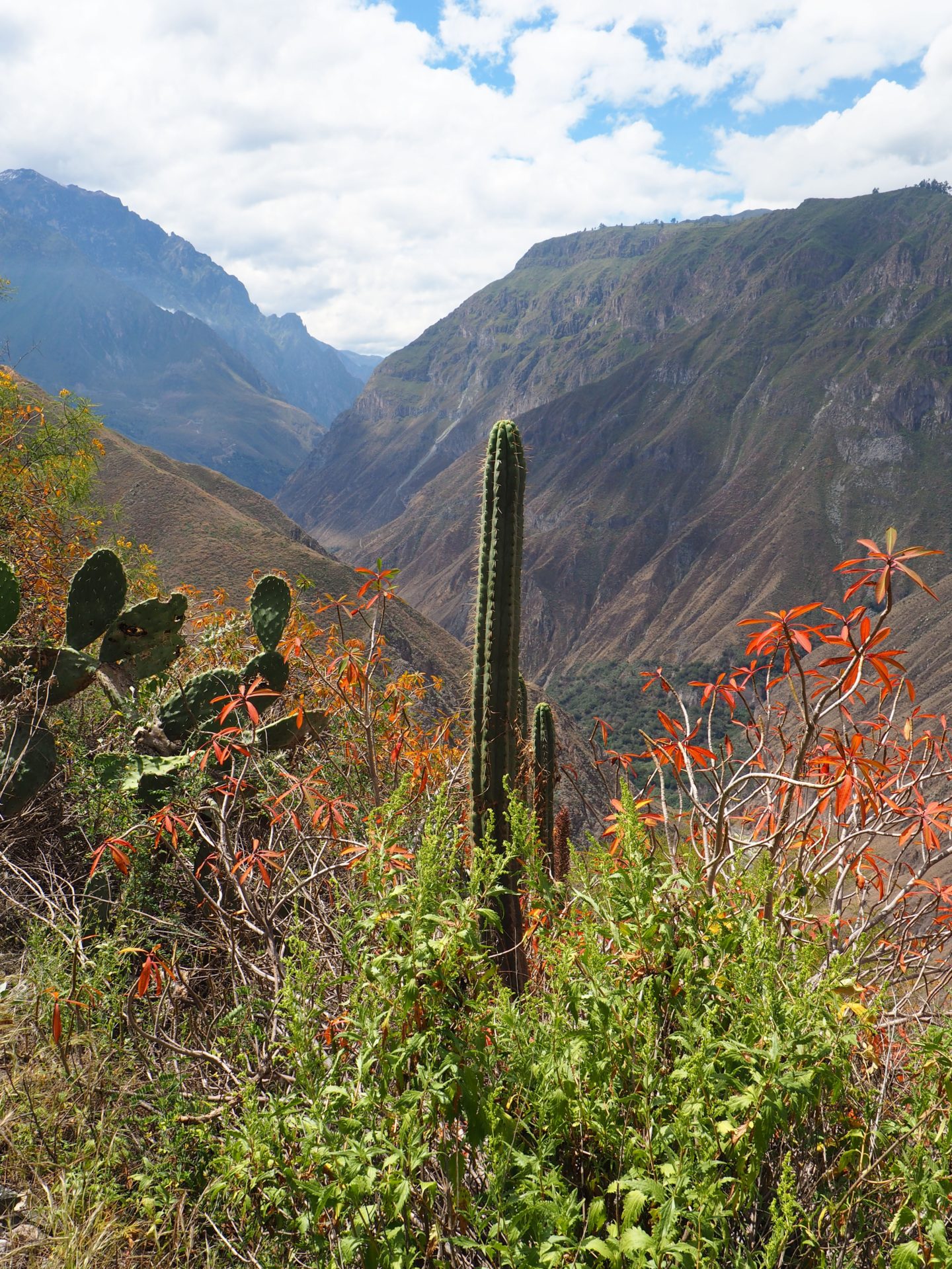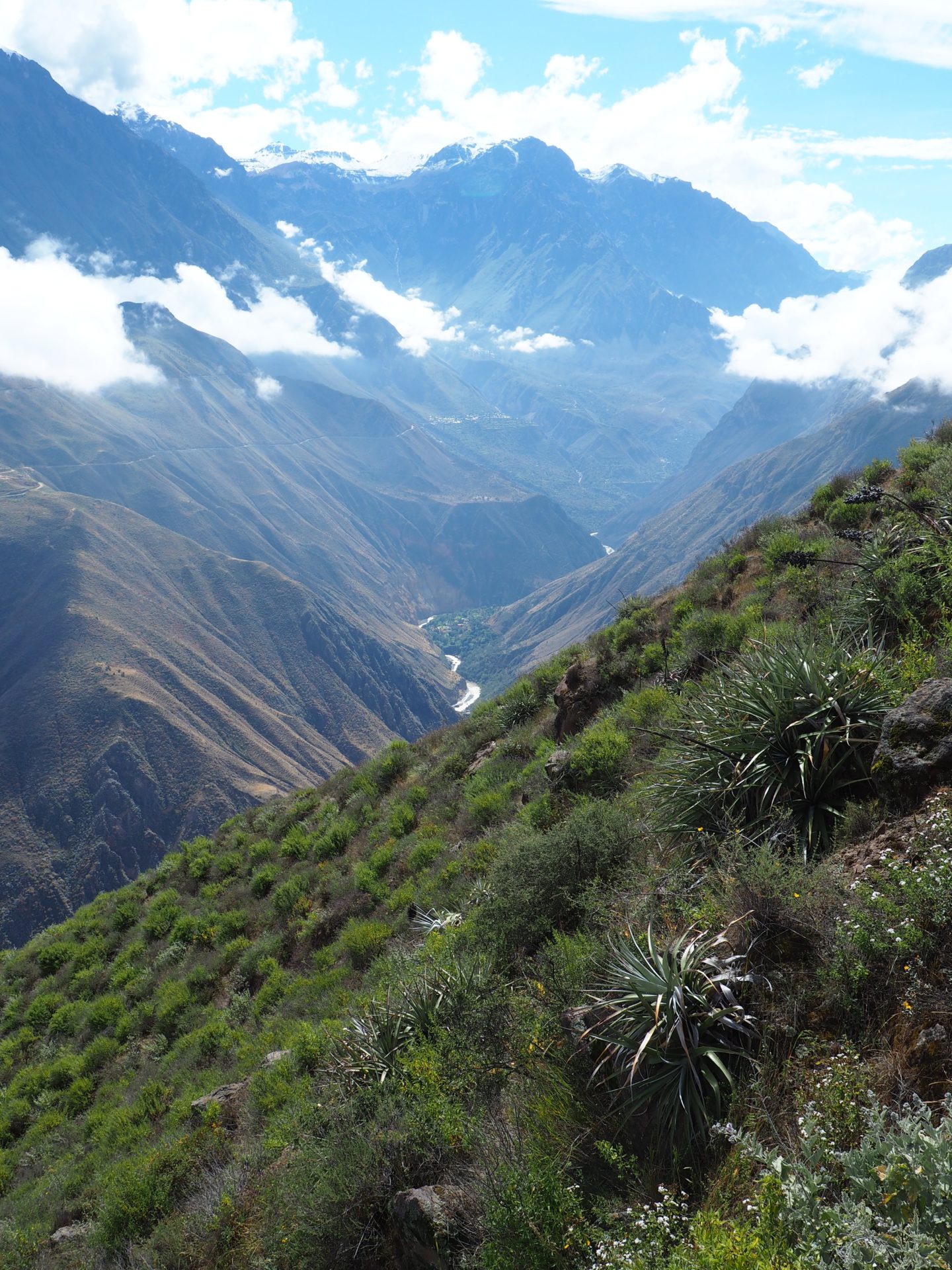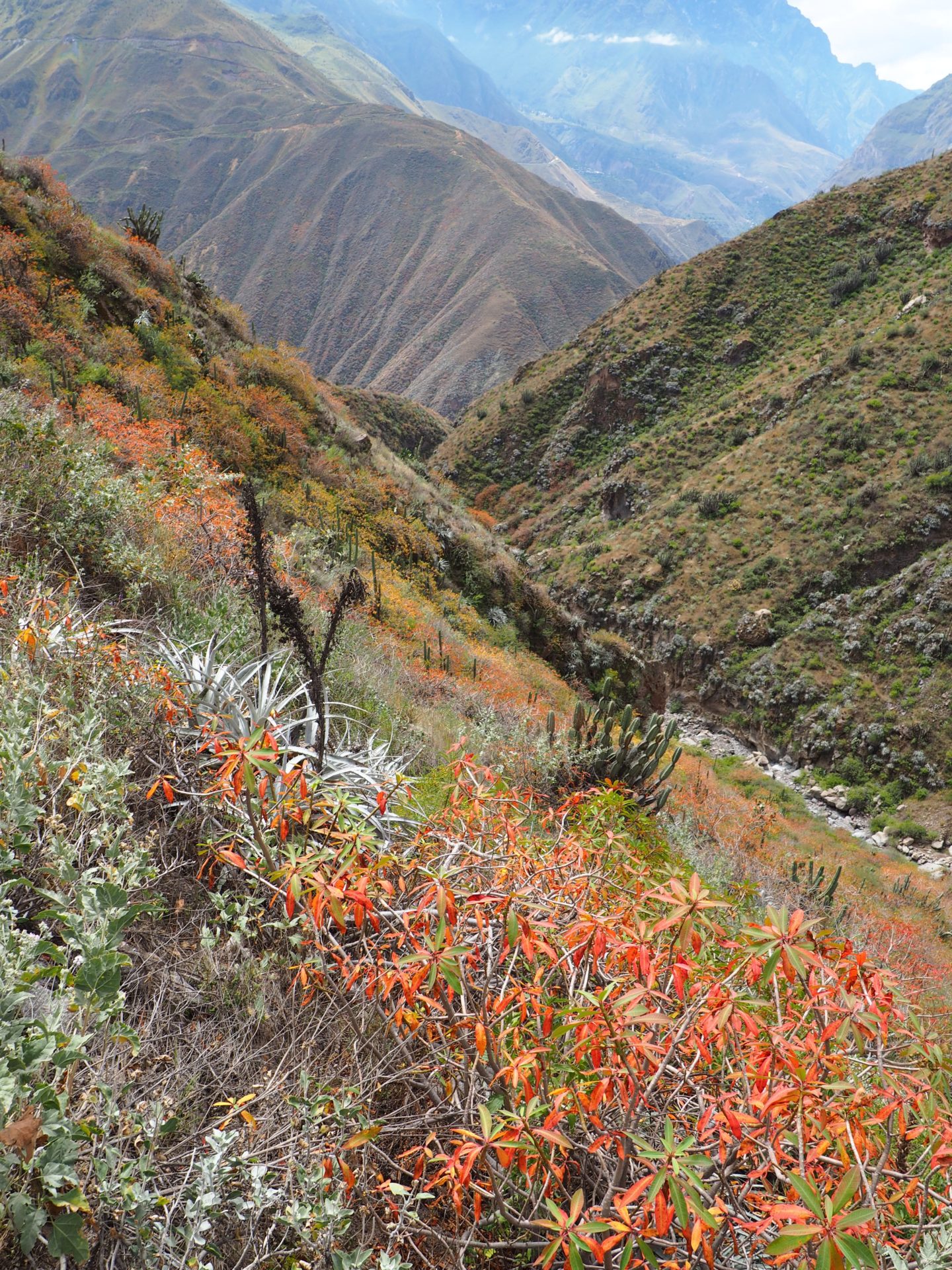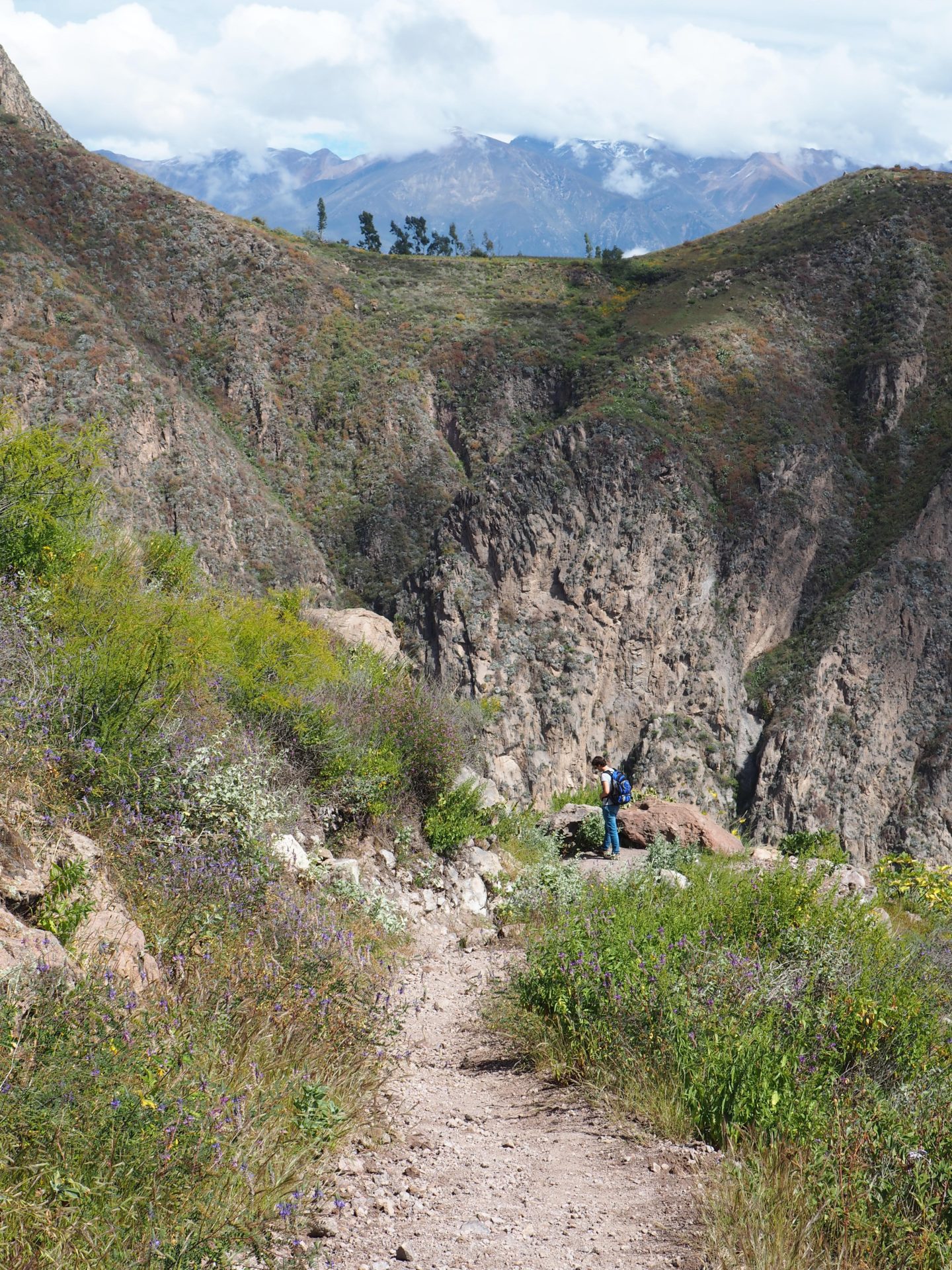 The landscape is very diverse, greener than I expected it to be and just keeps on changing with every bend you follow. Though some of the paths are very steep it’s all worth the effort. Fields of cacti, snow capped mountains in the backdrop, hot springs next to the river that runs amidst it all, an epic waterfall that suddenly springs from the rocks, stunning miradors, tiny villages, flowers all around, condors flying above your head, herds of llamas and alpacas; what’s not to like in here. In this canyon the journey really is the destination itself. Just look at the pictures and judge yourself!