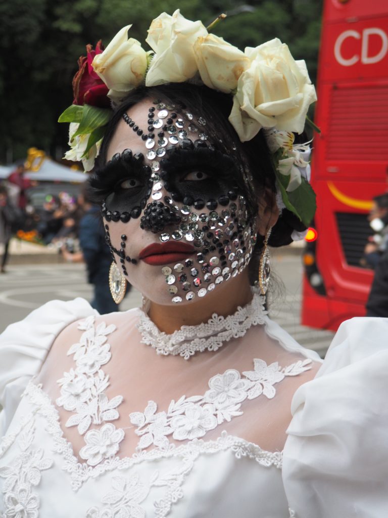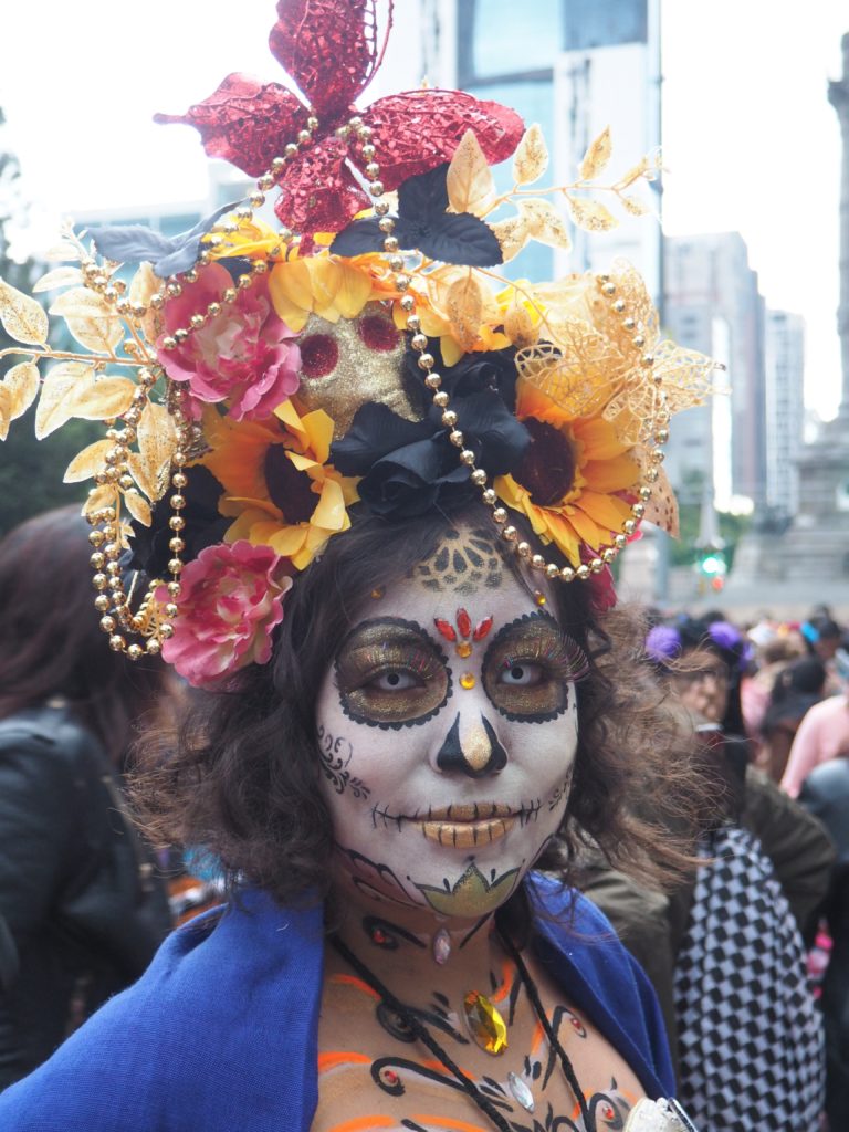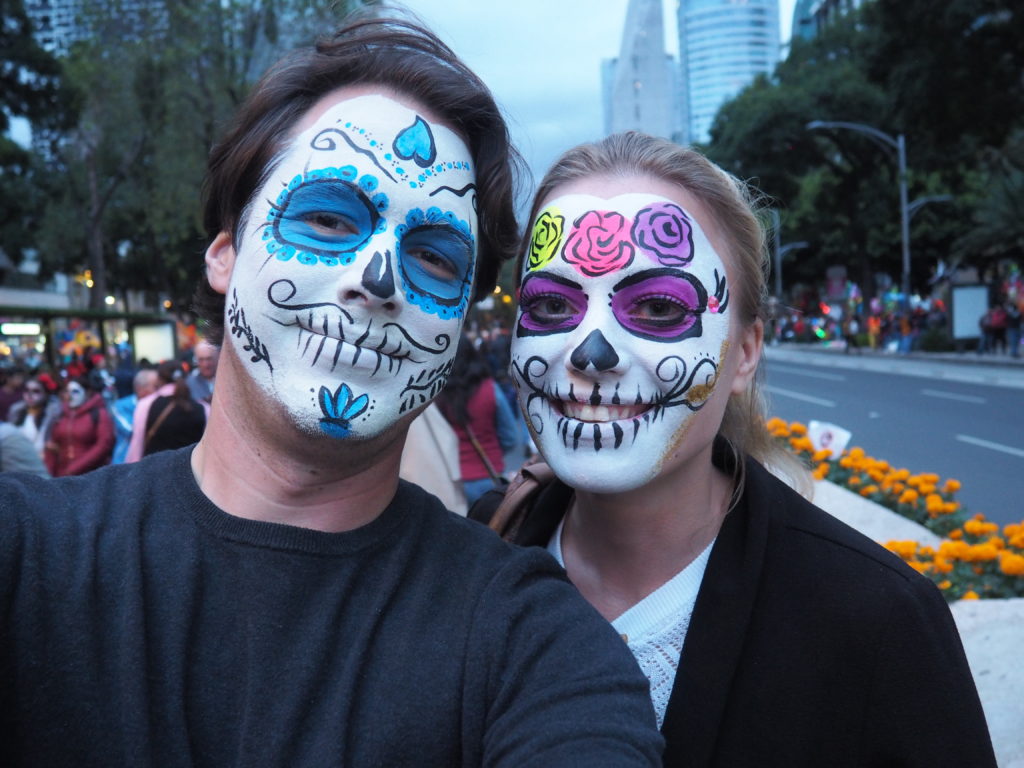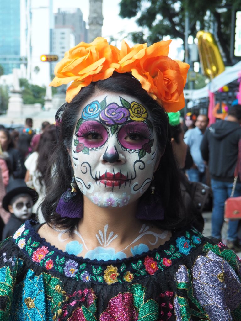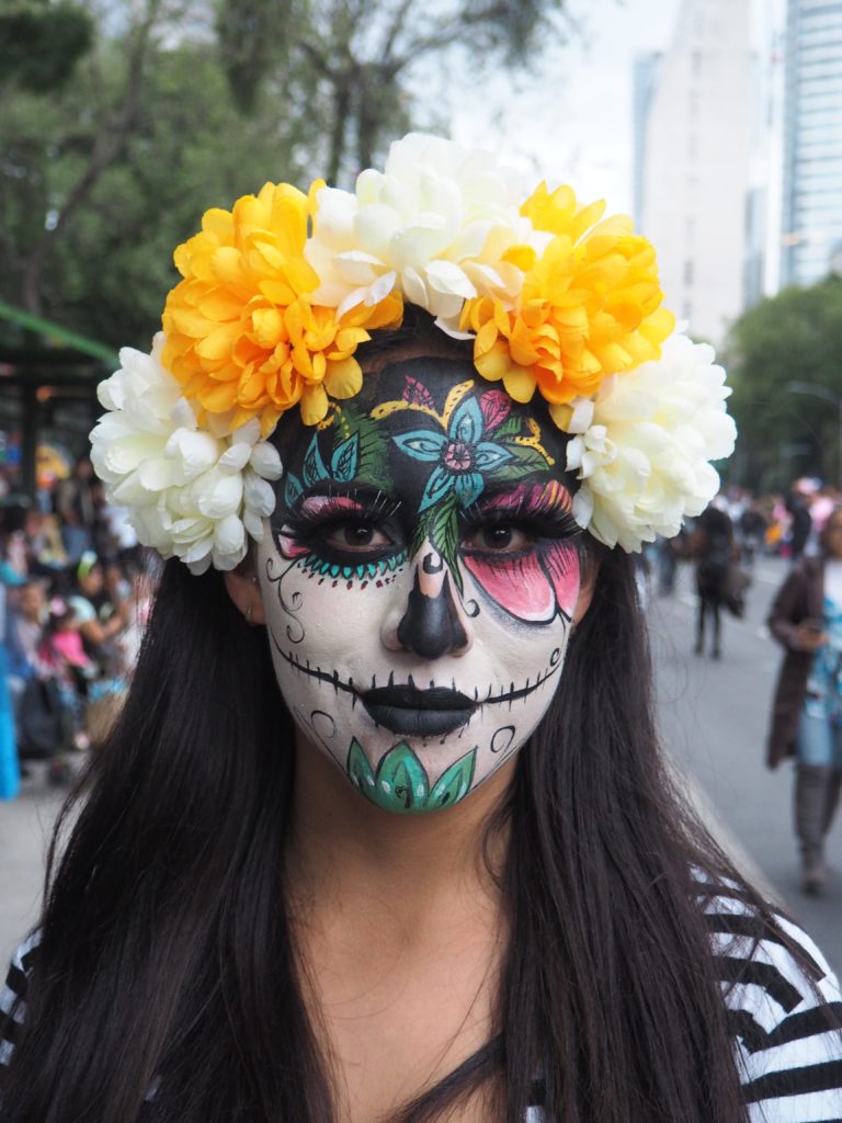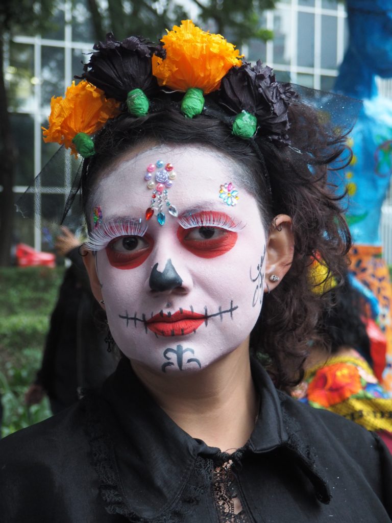Many folks paint their faces at home, but to those who have less experience doing so and prefer not to look like a big panda afterwards, you can also paint your face at the festival! Around the Paseo de la Reforma, on a corner next to the Angel de la Independencia, you’ll find quite some professional make up artists. For 100 to 200 MXN ($5,- to $10,- USD) they’ll paint you in whatever style you like.