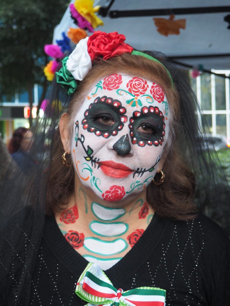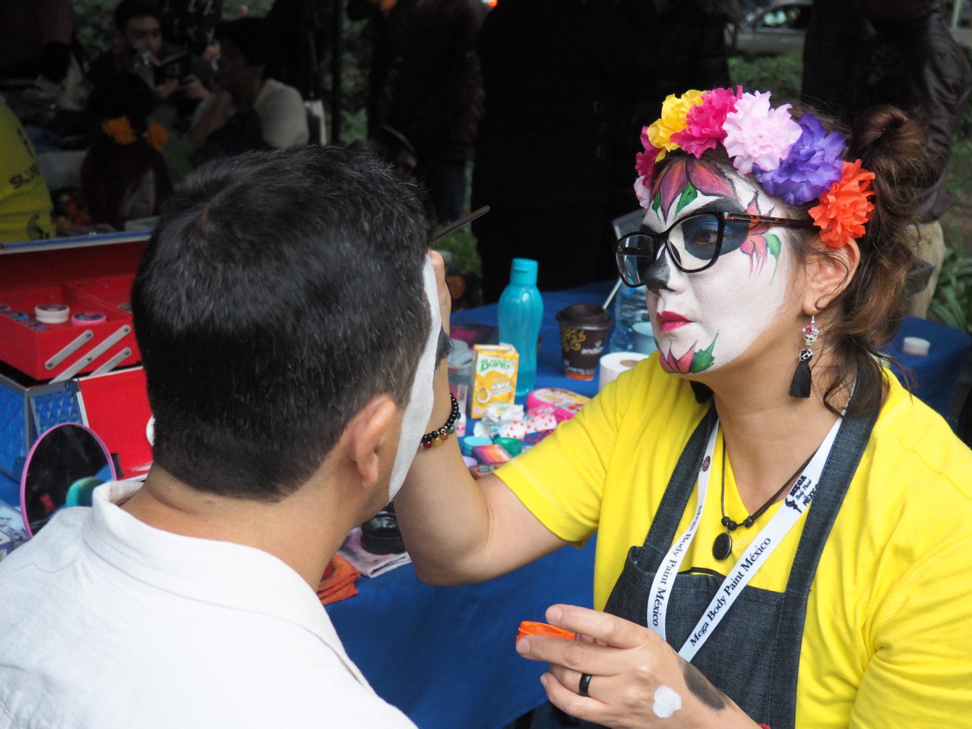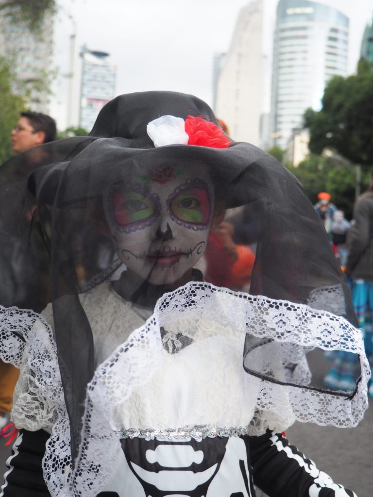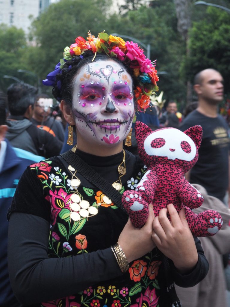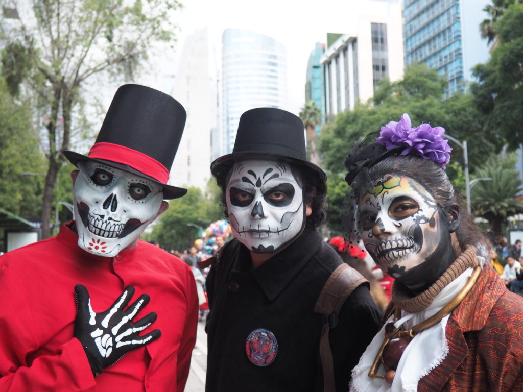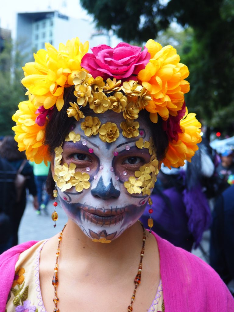 Many folks paint their faces at home, but to those who have less experience doing so and prefer not to look like a big panda afterwards, you can also paint your face at the festival! Around the Paseo de la Reforma, on a corner next to the Angel de la Independencia, you’ll find quite some professional make up artists. For 100 to 200 MXN ($5,- to $10,- USD) they’ll paint you in whatever style you like.