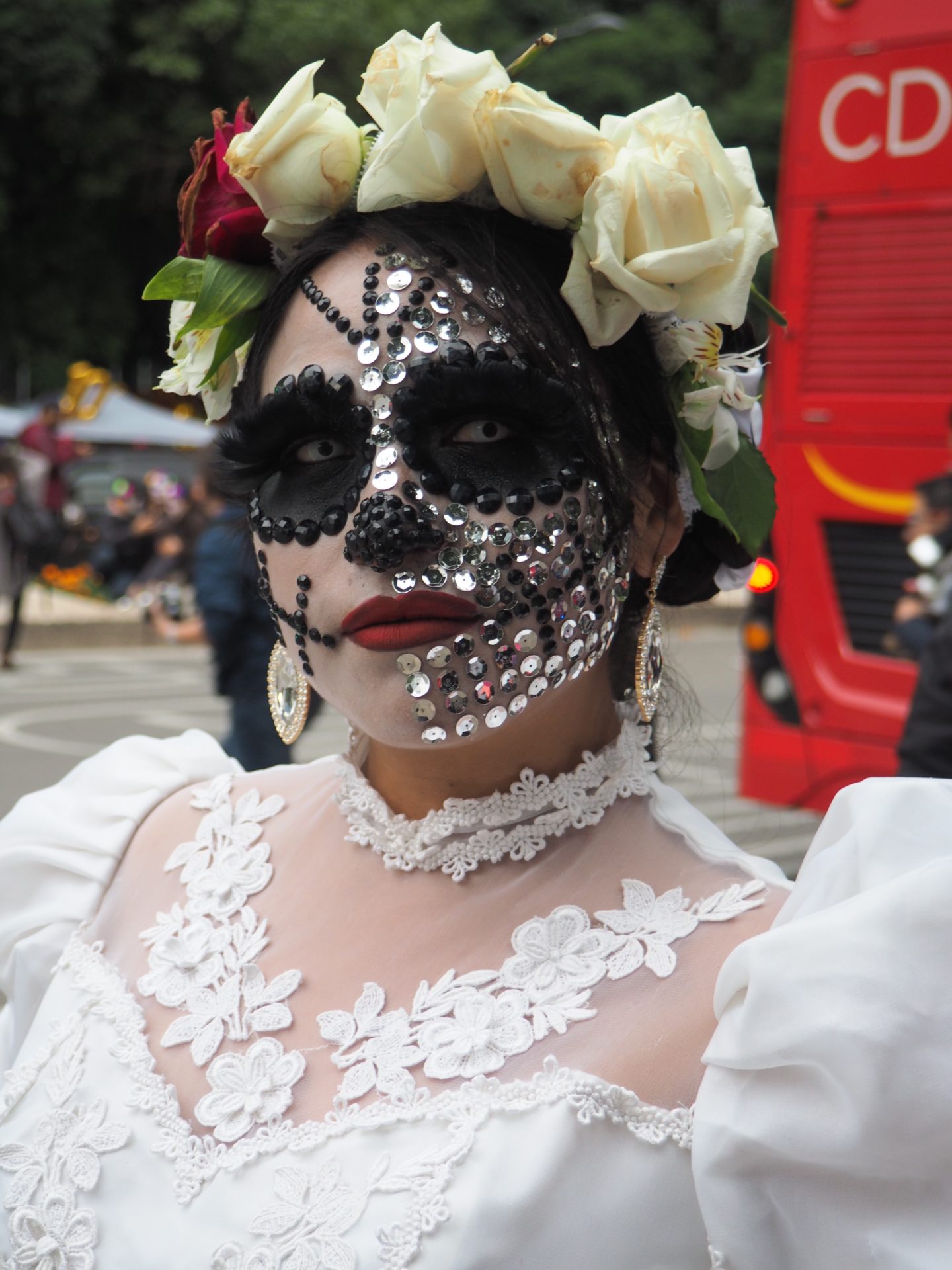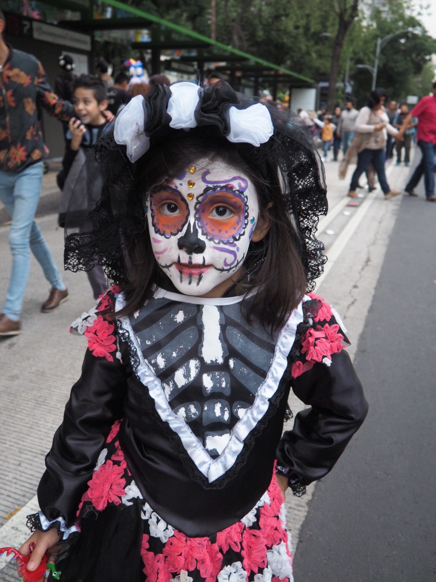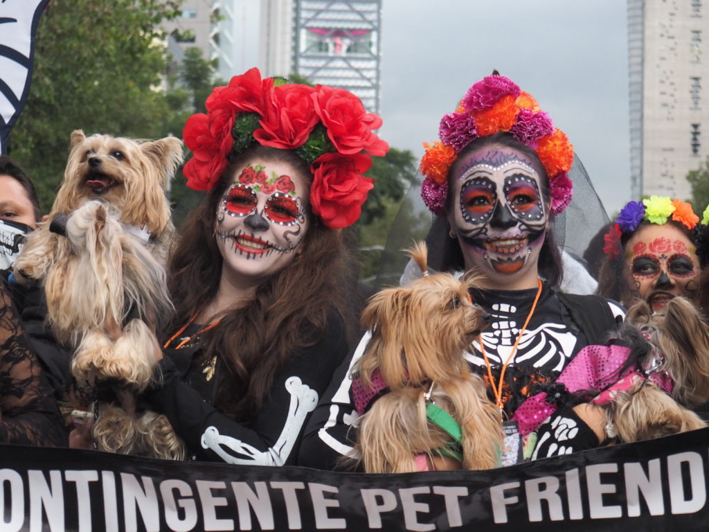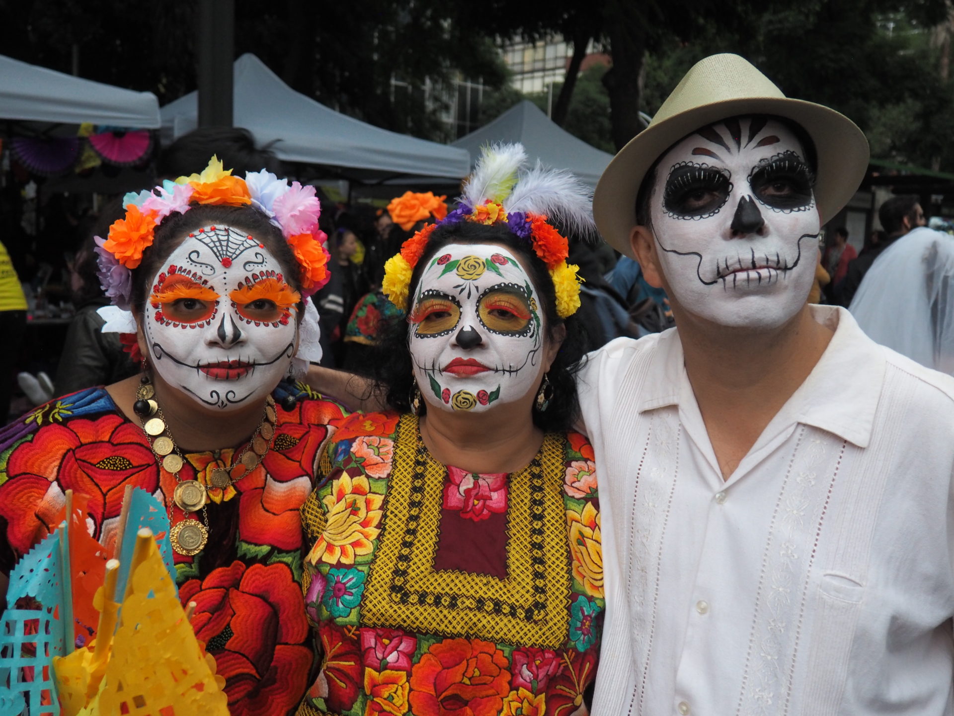 Many folks paint their faces at home, but to those who have less experience doing so and prefer not to look like a big panda afterwards, you can also paint your face at the festival! Around the Paseo de la Reforma, on a corner next to the Angel de la Independencia, you’ll find quite some professional make up artists. For 100 to 200 MXN ($5,- to $10,- USD) they’ll paint you in whatever style you like.