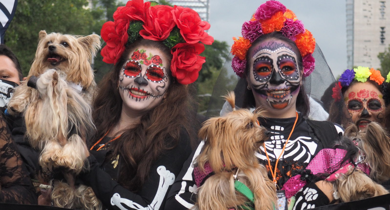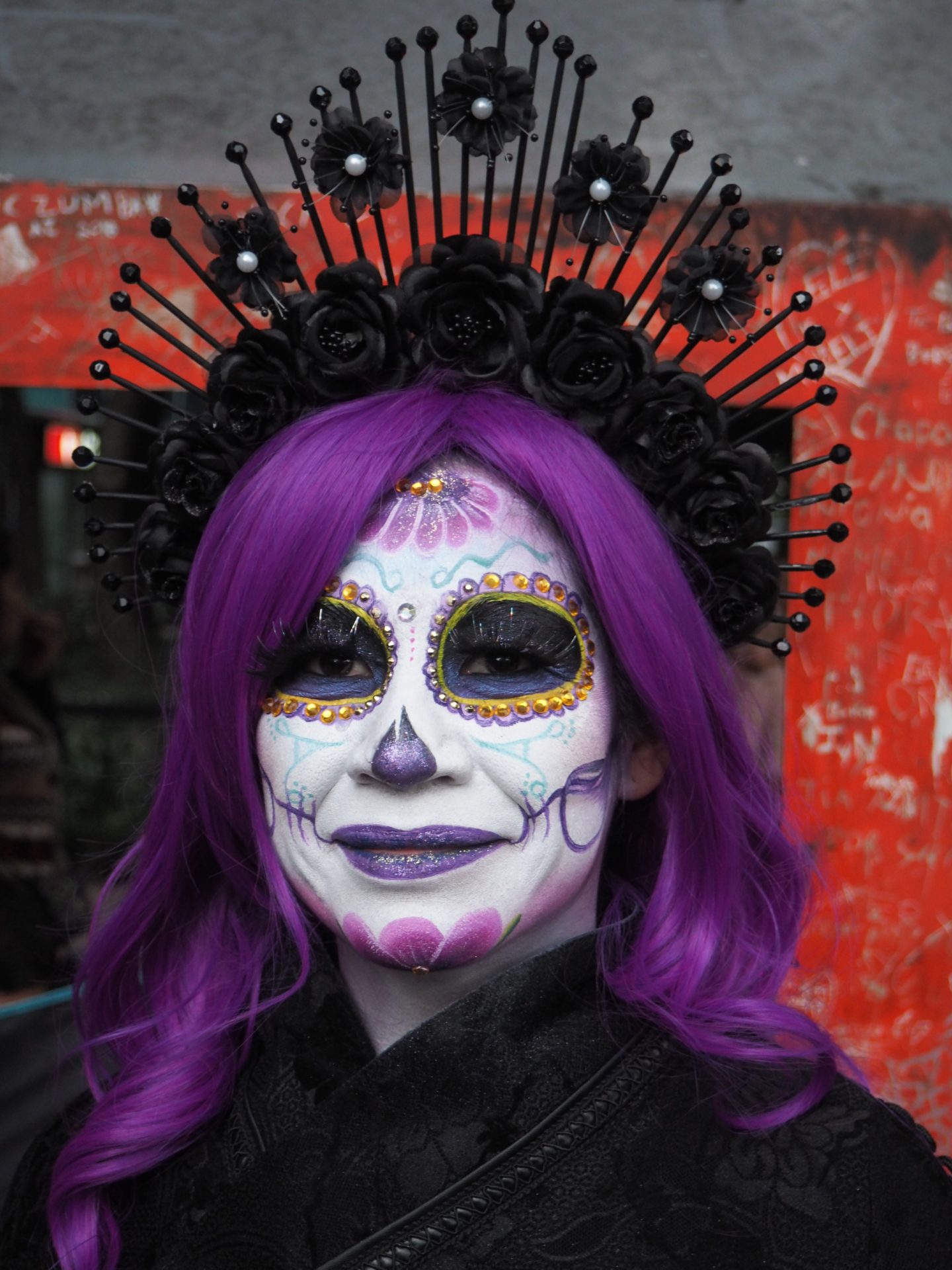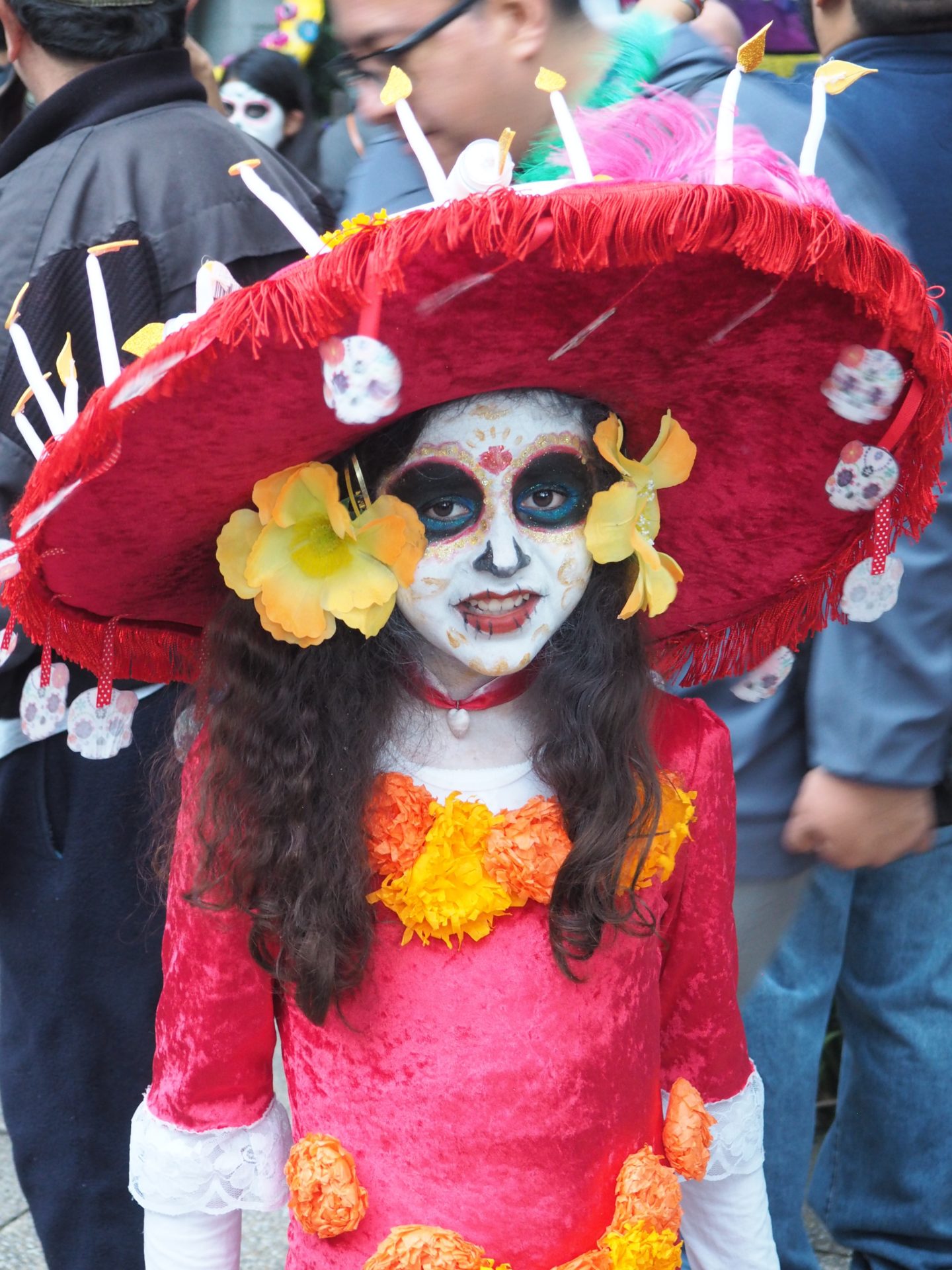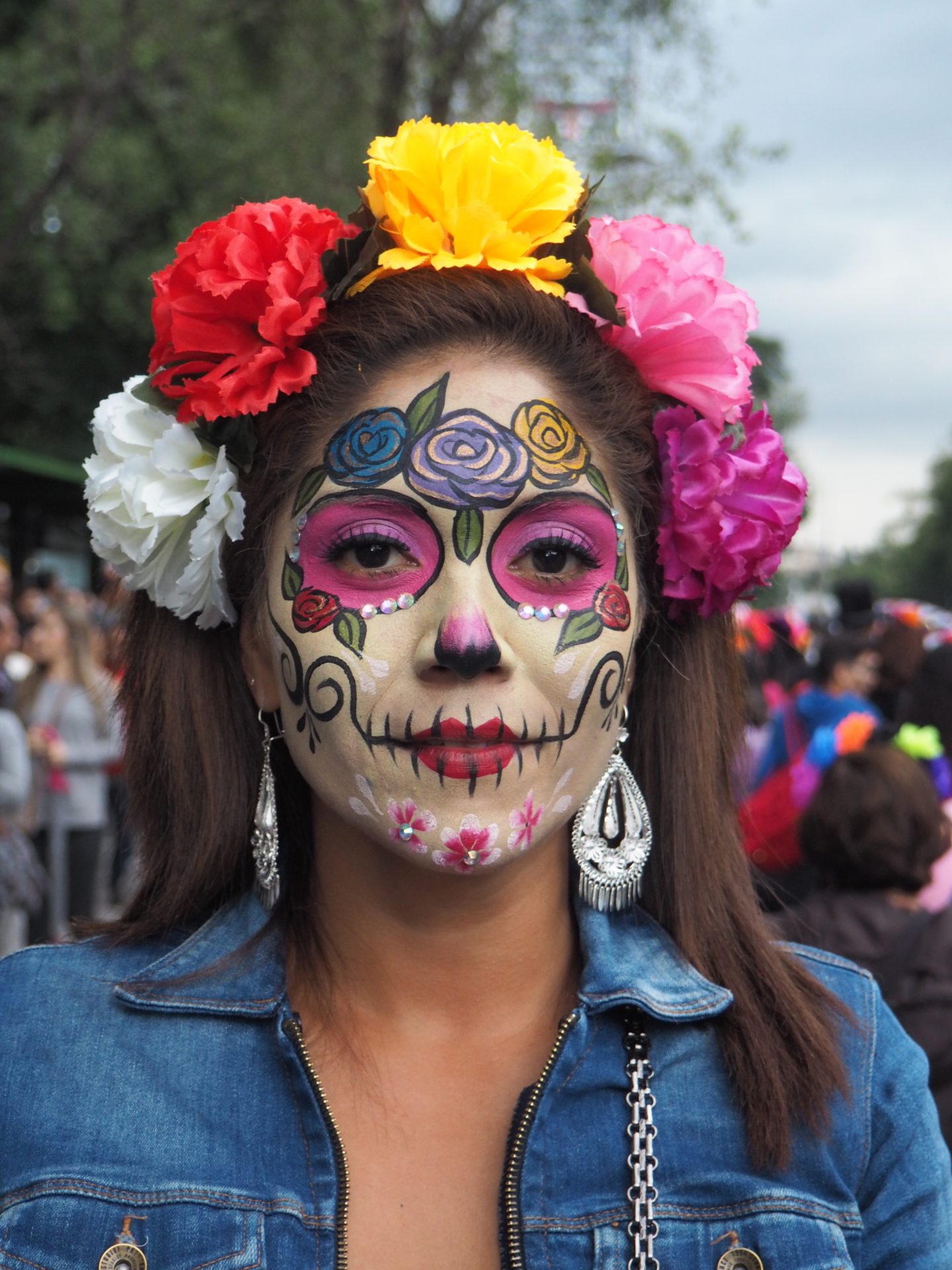 Many folks paint their faces at home, but to those who have less experience doing so and prefer not to look like a big panda afterwards, you can also paint your face at the festival! Around the Paseo de la Reforma, on a corner next to the Angel de la Independencia, you’ll find quite some professional make up artists. For 100 to 200 MXN ($5,- to $10,- USD) they’ll paint you in whatever style you like.
