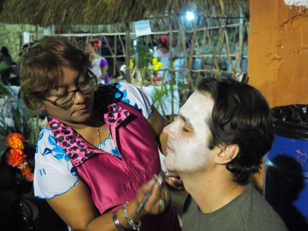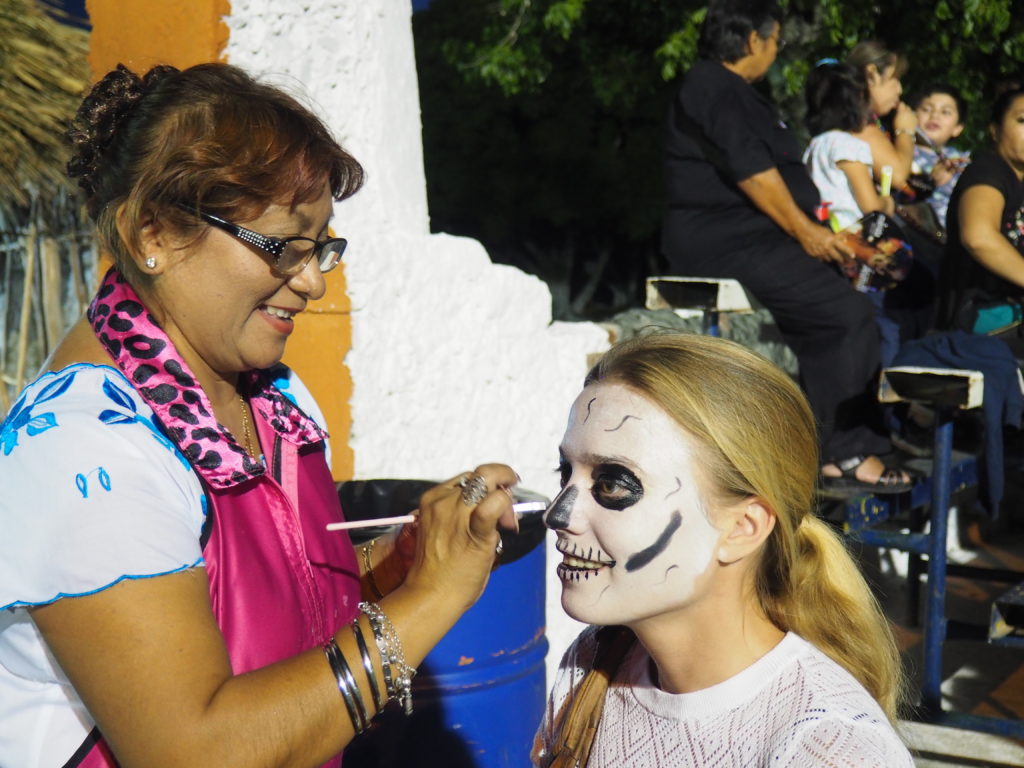 And so did we. Right in front of the cemetery there was ample opportunity to let that inner skeleton out. For only 20 MXN ($1,- USD) ladies were eager to smack some black and white on those cheeks.