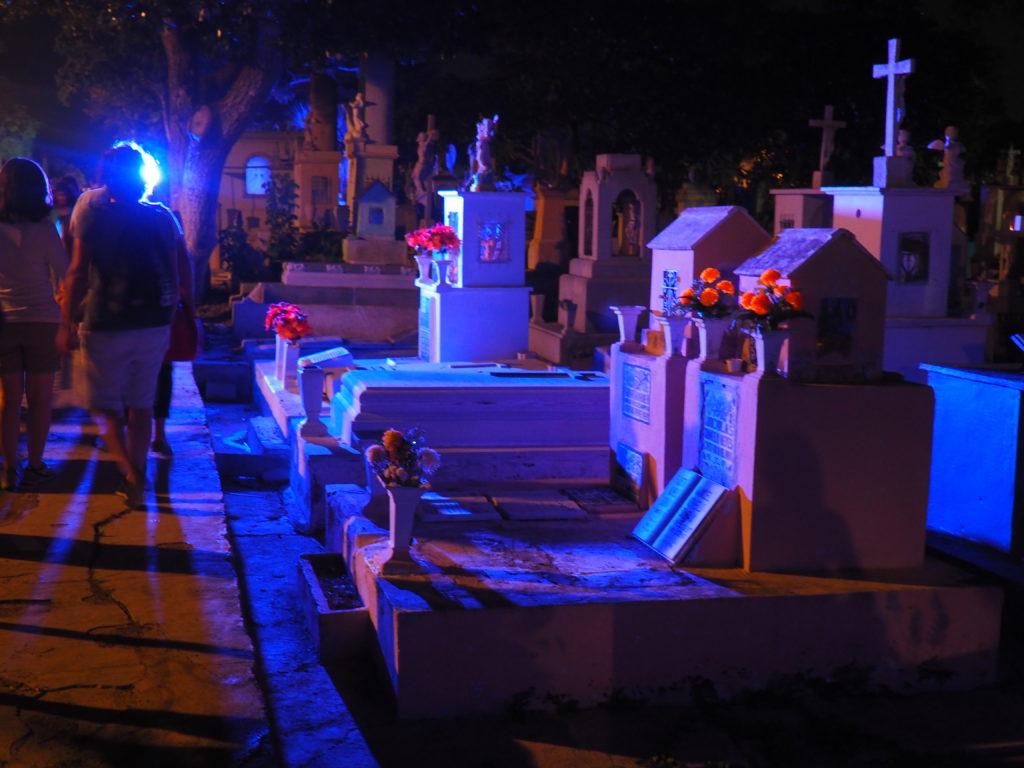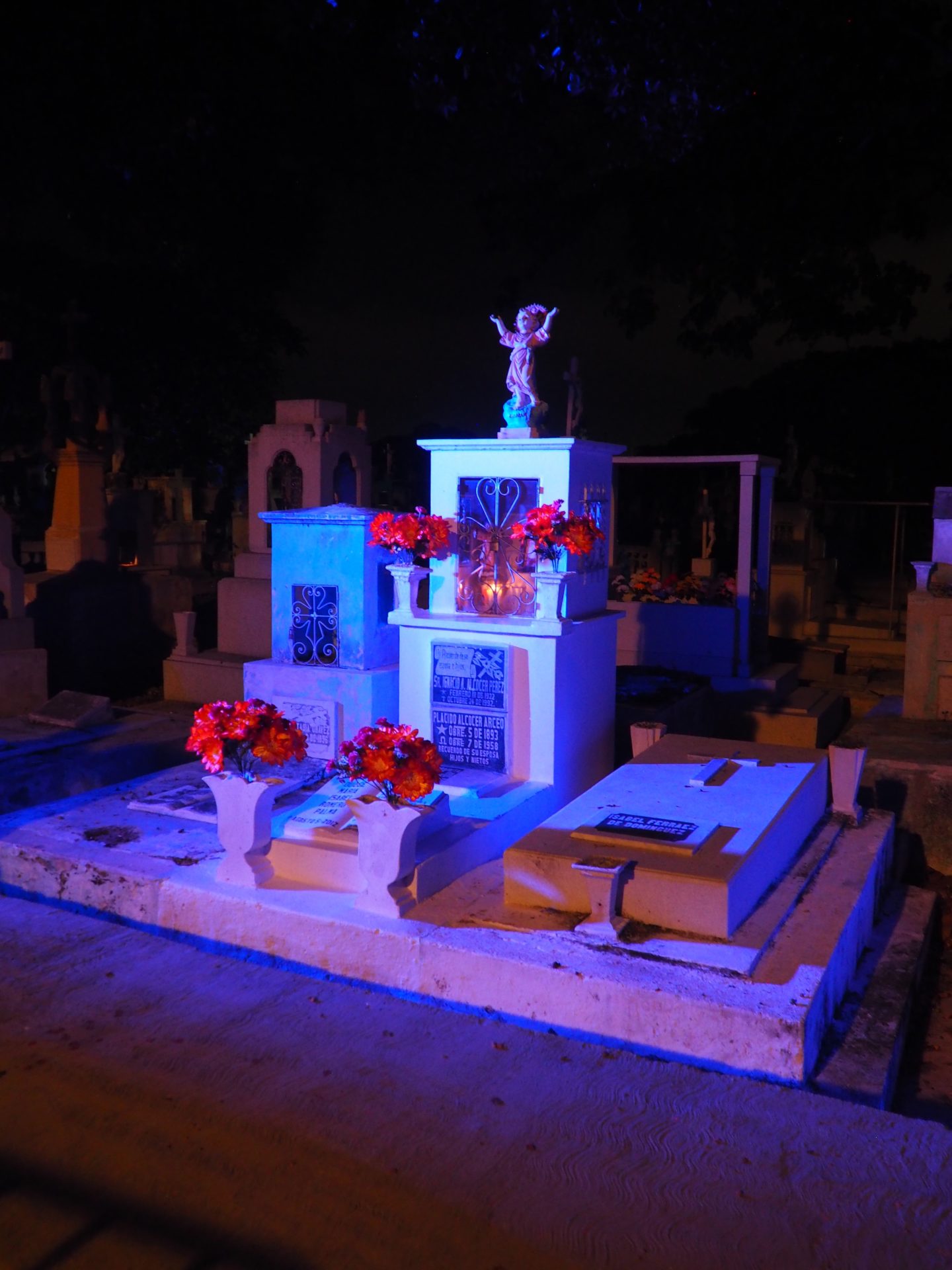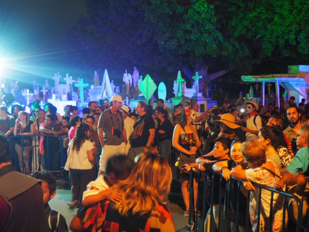 It had something eerie, to see all of the ‘skeletons’ walking around the poorly lit cemetery, where many graves were decorated with flowers and colourful gifts.
