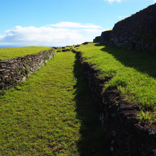 The moai are swept from their feet at this spot, but because of their backdrop it’s still a fascinating place and worthwhile to visit. Not only are the views on the rugged coastline – the one you’ll drive today – absolutely stunning, the moai are also situated near a very thick wall, probably their former ahu. The large stones fit perfectly into one another, which is really remarkable.