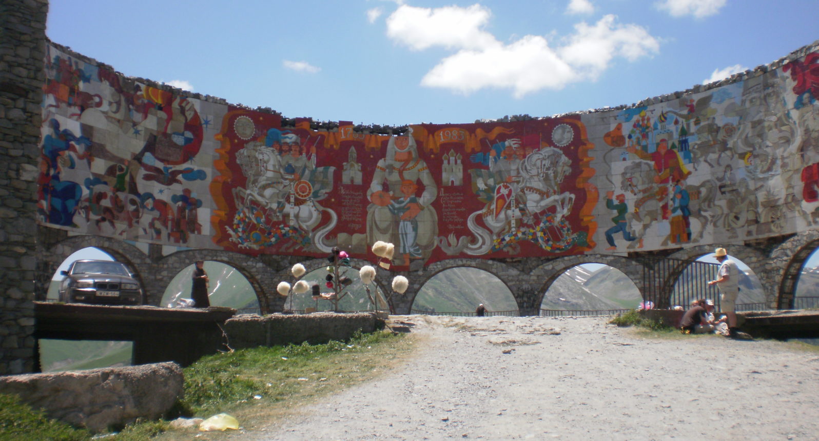But back to the monument. It’s old and in bit in decay, but nonetheless rather impressive. Inside the monument is a large tile mural that spans the whole circumference of the structure and depicts scenes of Georgian and Russian history. With the gorgeous mountains in the backdrop and the Devil’s valley beneath you, stopping here is quite a must in my humble opinion. If only for a minute because of the breathtaking views.