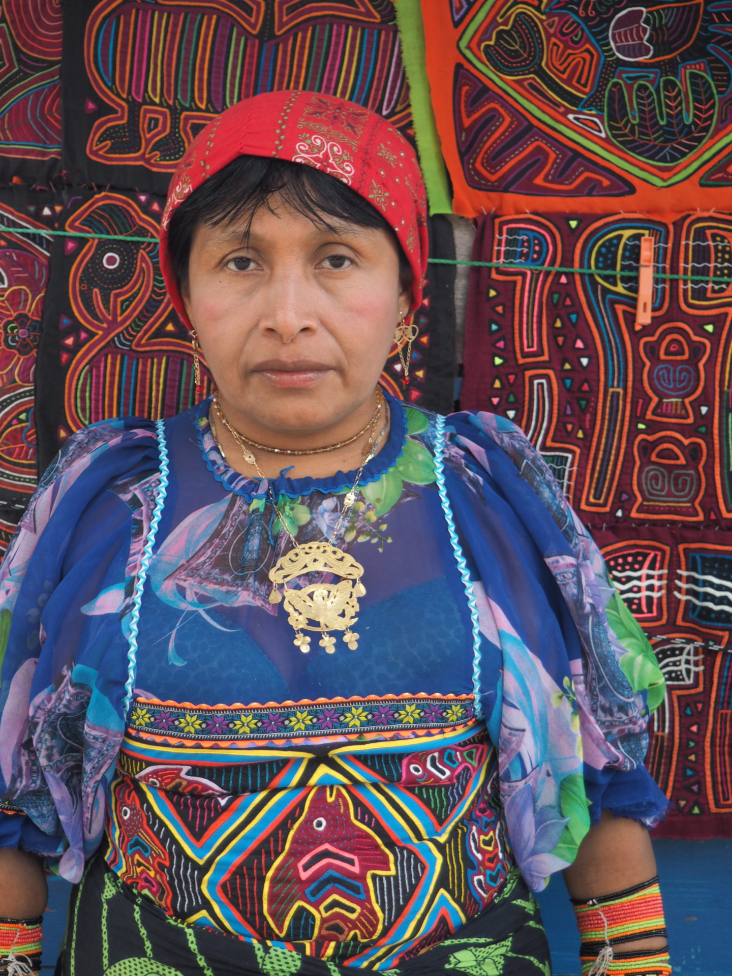 Some 50.000 of the Guna still live scattered around in San Blas. The men wear western clothing, but the women still adorn themselves in customary garb - with geometrical patterns from ankles to knees, 'molas' (handcrafted blouses) and a LOT of gold to top it off. All of this decoration marks tradition too, the septum for example is pierced whenever a girl gets her first period. Picture one is from our cook on the island Senidup. I heard that some Guna ask for a dollar per photo, but I guess it depends on how touristy the island is. Picture two is a Guna in front of her self-made 'molas'. Since the Guna don't want the tourists to wear their clothes, they only create linen to sell.