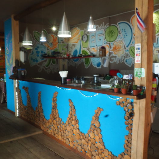 Luckily not only the cocktails and appetizers are yummy, but the dishes on the menu are quite okay too. Perhaps you even see the ‘house sloth’. The tree he lives in stands in the middle of the restaurant and he often comes down when there’s a bit of rain.