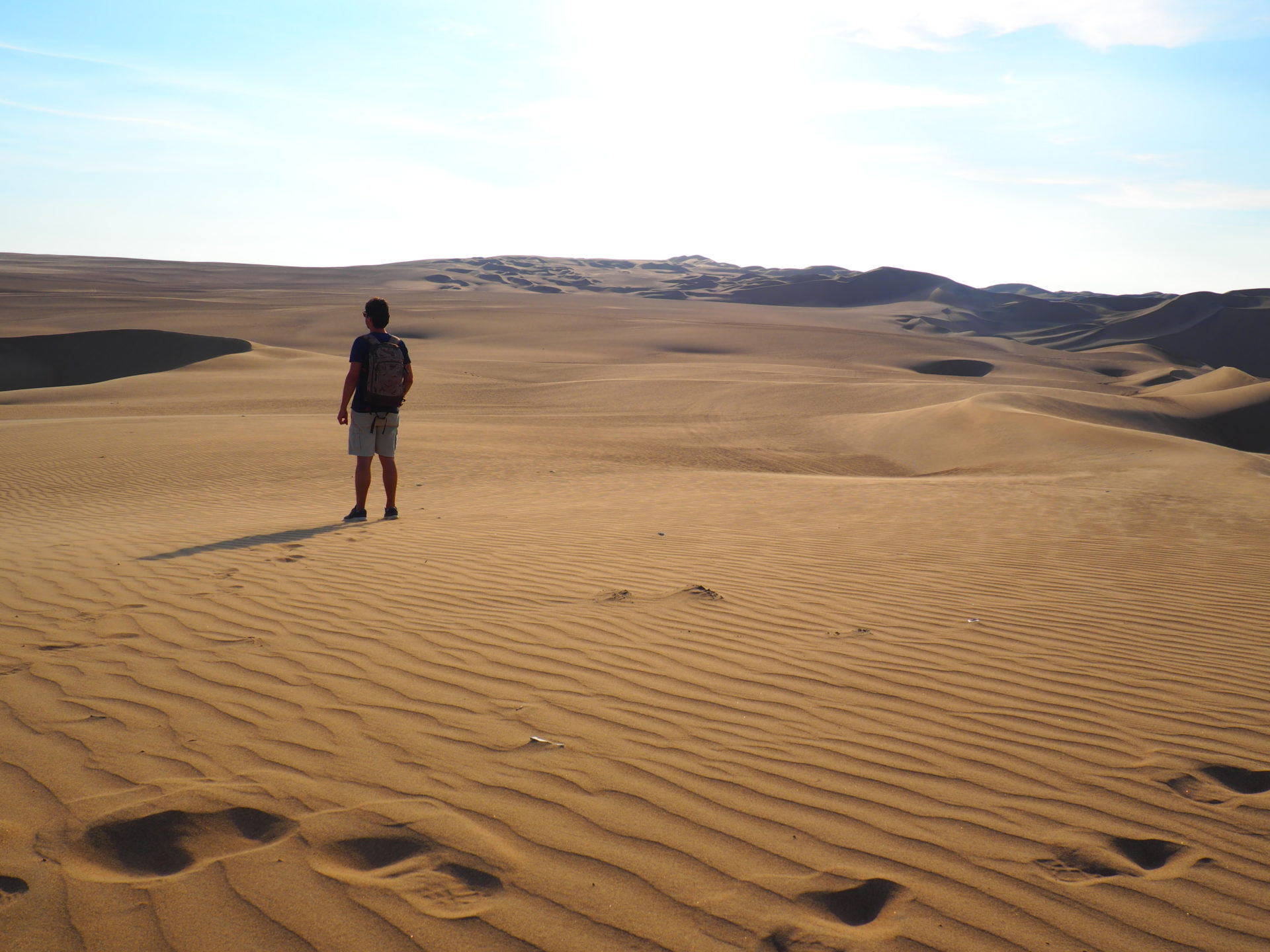 After the hair-raising ride we did a first try of sand boarding, at a small hill. As I’d expected an equivalent of snow boarding, I was surprised to experience that you’re not really standing on the boards while sliding down. I mean if you want to, you can try it out, but since the boards are just very simple, wooden boards with pieces of fabric on it to tie to your feet on to, this isn’t as easy as it looks.