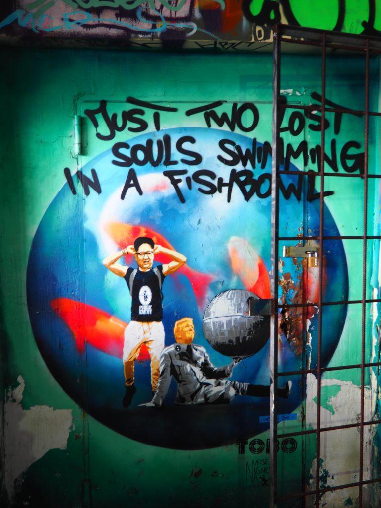 Basically all of the surfaces are decked with very good, if sometimes disturbing displays. Since this is Berlin and Berlin isn’t any stranger to a bit of underground anarchy, brace yourself for some political exclaims. No need to tell you what pouting political leader is a regular ‘model’ throughout the buildings.