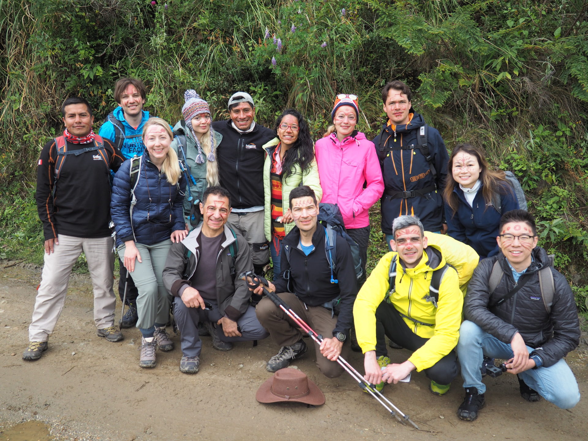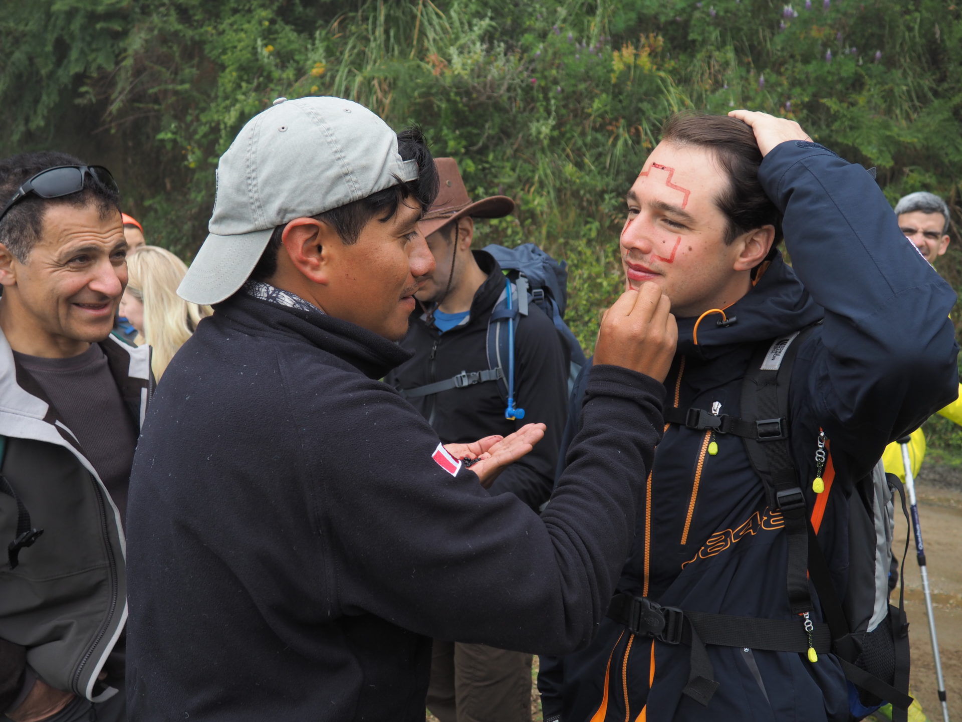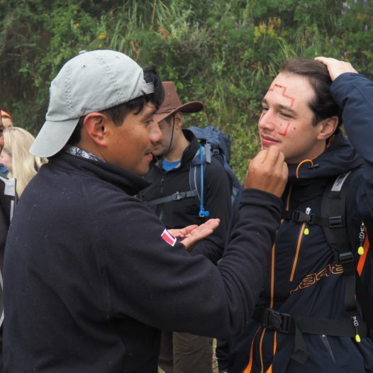 As we had been out there in the wild and our faces were getting dirty, bleak and grim, Marco decided we needed some brushing up. So right after breakfast he browsed in the bushes for a certain plant, took out its red seeds and began polishing up our faces with these inca patterns. Make-up time!